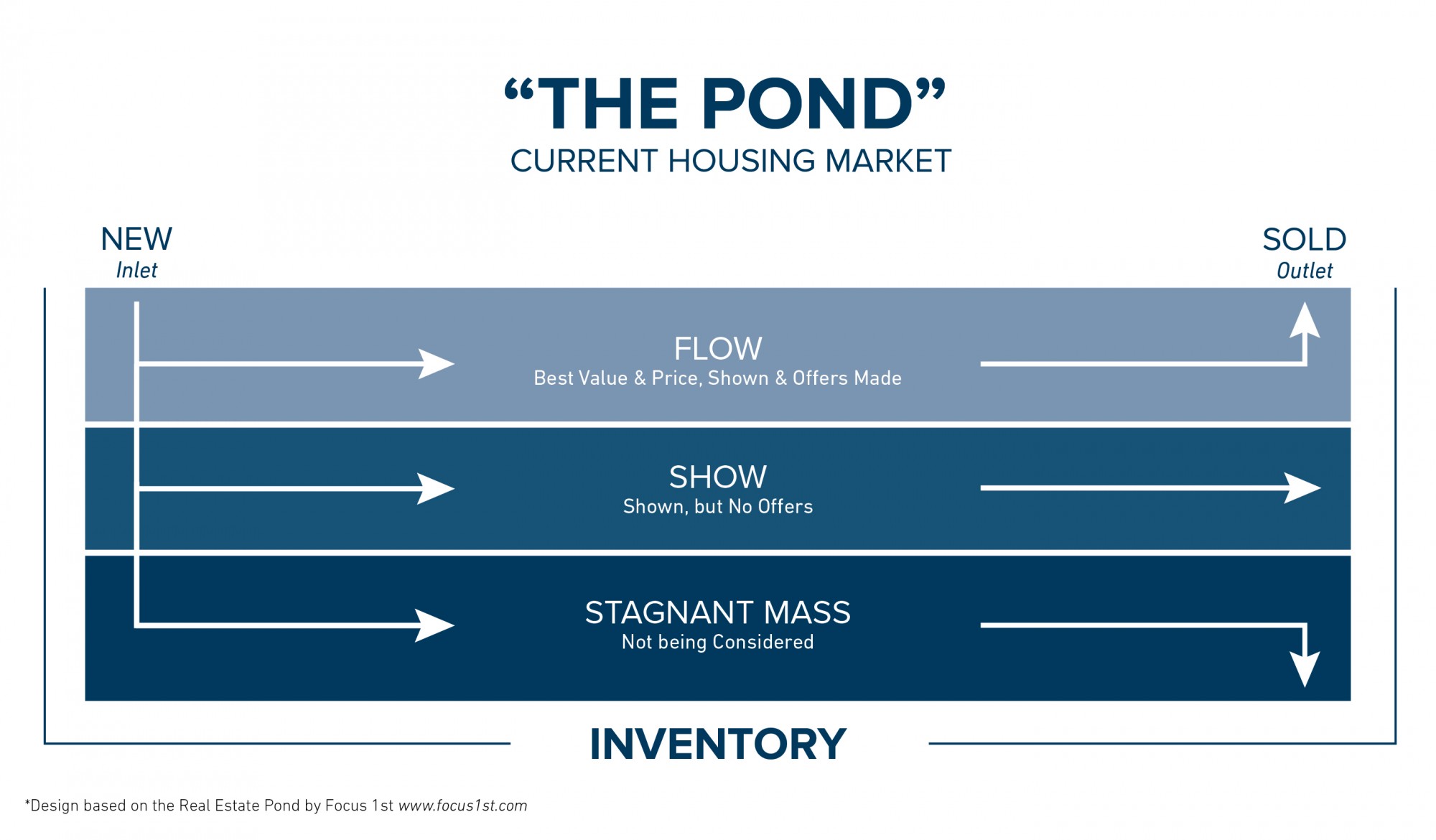 Think of the housing market like a pond. There are always new properties flowing into the pond and out when they sell. Your goal is to stay in the pond’s flow (toward the top), so you move in and out as quickly as possible. To do this, you need to make sure the price is right, that you market your home correctly and that you prepare your home for showings.