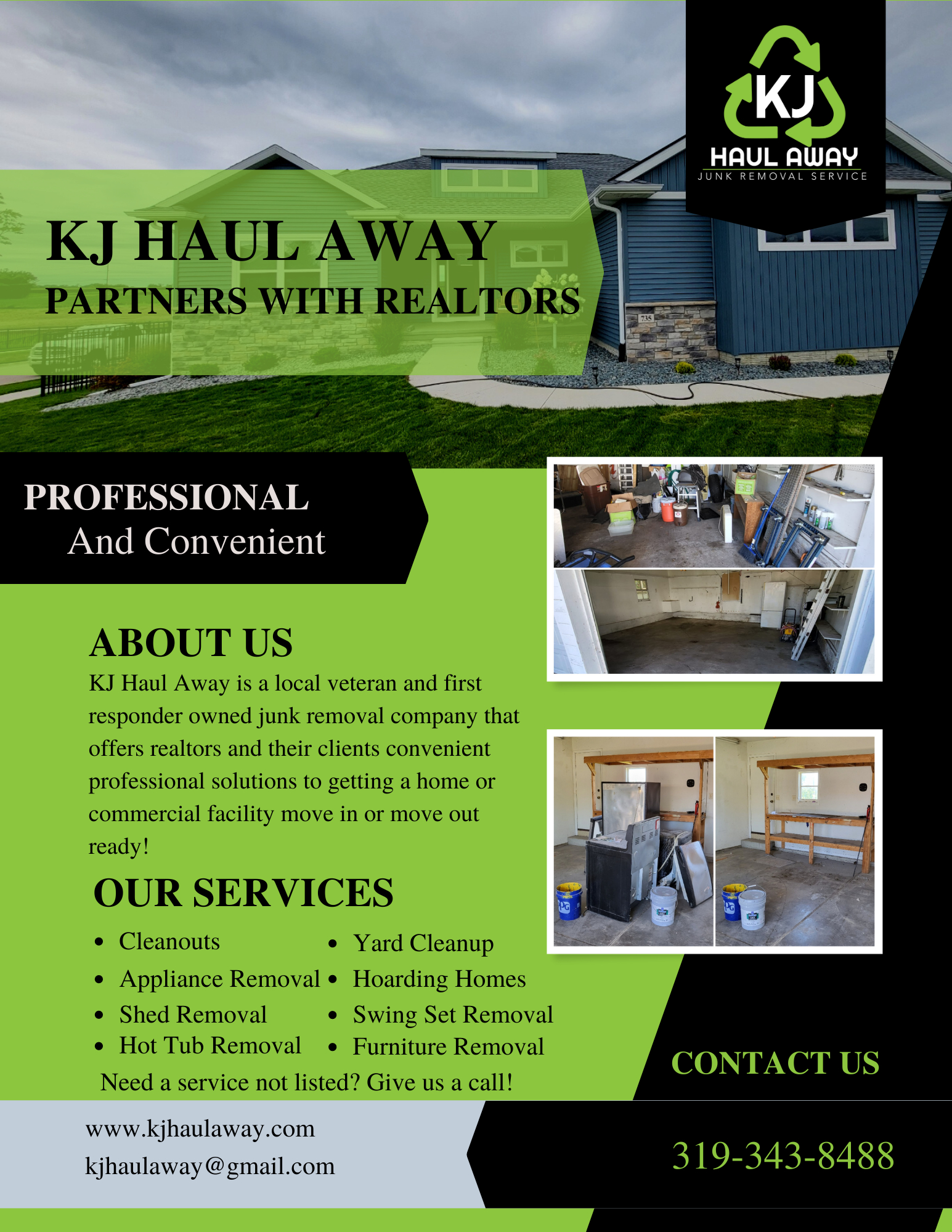 KJ Haul Away is a local junk removal and demolition company owned and operated by Kyle Ugarph. We serve residents of eastern Iowa both residential and commercial by removing unwanted items and stressful situations through proper disposal, recycling, and repurposing. KJ Haul Away will allow Ruhl&Ruhl Realtors to provide their teams and their clients with a professional, convenient, and prompt solution to their junk removal and demolition needs. We remove anything from single items to full house clean outs as well as tear down and removal of hot tubs, sheds, swing sets, fences, and more. Let’s work together in making the buying/selling process an easy and enjoyable experience for your clients!